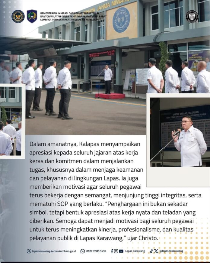“Penghargaan ini bukan sekadar simbol, tetapi bentuk apresiasi atas kerja nyata dan keteladanan yang diberikan. Semoga dapat menjadi motivasi bagi seluruh pegawai untuk terus meningkatkan kinerja, profesionalisme, serta kualitas pelayanan publik di Lapas Karawang,” ujar Christo.