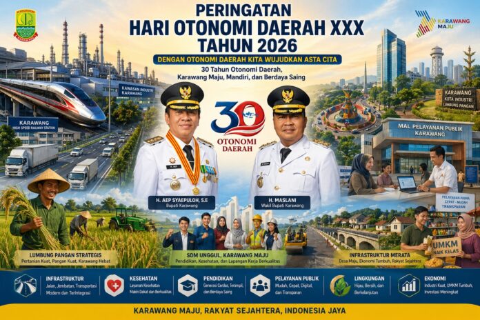 KARAWANG – Peringatan Hari Otonomi Daerah ke-30 Tahun 2026 menjadi momentum strategis bagi Kabupaten Karawang untuk memperkuat arah pembangunan yang semakin mandiri, maju, dan berdaya saing. Di bawah kepemimpinan Bupati Karawang H. Aep Syaepuloh, S.E. dan Wakil Bupati H. Maslani, roda pemerintahan terus diarahkan pada peningkatan kinerja seluruh perangkat daerah, percepatan pelayanan publik, pembangunan infrastruktur, serta penguatan ekonomi kerakyatan.