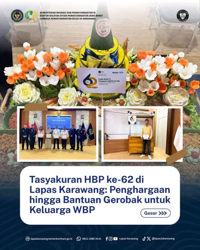 Karawang — Lembaga Pemasyarakatan (Lapas) Karawang menggelar tasyakuran dalam rangka memperingati Hari Bakti Pemasyarakatan (HBP) ke-62, Senin (27/4), bertempat di Aula Sahardjo Lapas Karawang. Kegiatan ini diikuti oleh seluruh petugas dan merupakan bagian dari peringatan nasional yang dipusatkan di Politeknik Imigrasi dan Pemasyarakatan.