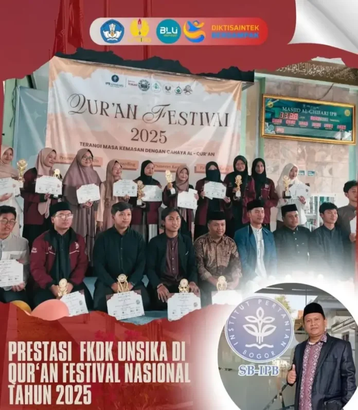 BOGOR, Sanggabuananews.com – Universitas Singaperbangsa Karawang (UNSIKA) kembali menorehkan kebanggaan melalui Unit Kegiatan Mahasiswa Forum Komunikasi Dakwah Kampus (FKDK). Dalam ajang Qur’an Festival Nasional Tahun 2025 yang digelar oleh Rohis Sekolah Vokasi Institut Pertanian Bogor (IPB), pada hari Minggu 21 September 2025. FKDK UNSIKA berhasil meraih prestasi gemilang dan membawa pulang sejumlah gelar juara.