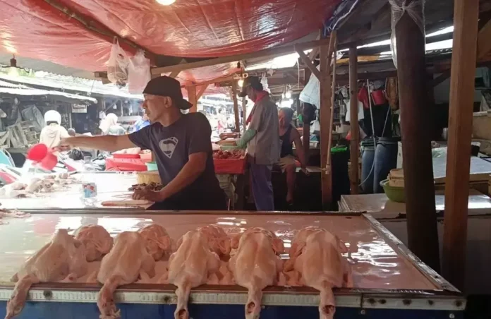 Karawang, Sanggabuananews.com – Harga daging ayam di Pasar Baru Karawang, Jawa Barat, melonjak tajam dalam dua pekan terakhir hingga menyentuh Rp 65.000 per kilogram. Kenaikan ini membuat pedagang dan pelaku usaha kuliner kesulitan bertahan.