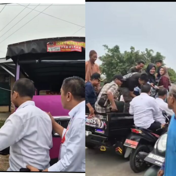 Dengan mengenakan pakaian sederhana, Aep Syaepullah tampak membonceng sepeda motor untuk menembus keramaian. Kehadirannya disambut warga yang memadati sisi jalan, sebagian di antaranya mengabadikan momen tersebut menggunakan ponsel.