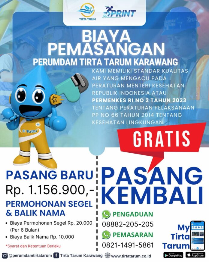 KARAWANG – Perusahaan Umum Daerah Air Minum (Perumdam) Tirta Tarum Karawang terus meningkatkan pelayanan kepada masyarakat dengan menghadirkan program pemasangan air bersih yang terjangkau dan berkualitas.