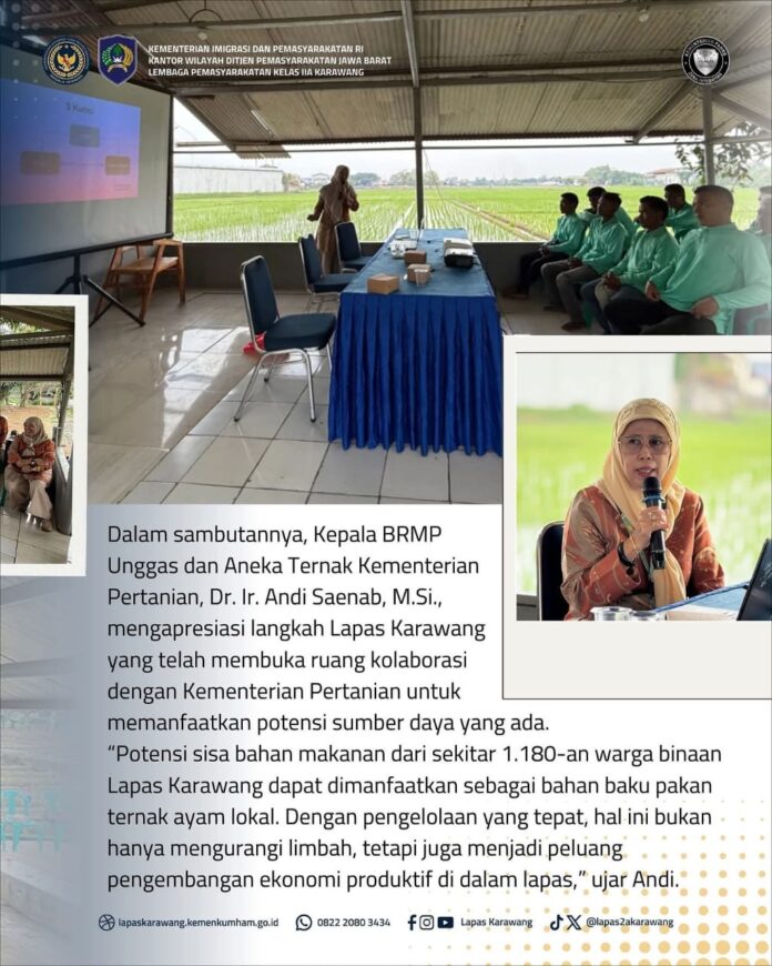 “Potensi sisa bahan makanan dari sekitar 1.180-an warga binaan Lapas Karawang dapat dimanfaatkan sebagai bahan baku pakan ternak ayam lokal. Dengan pengelolaan yang tepat, hal ini bukan hanya mengurangi limbah, tetapi juga menjadi peluang pengembangan ekonomi produktif di dalam lapas,” ujar Andi Saenab.