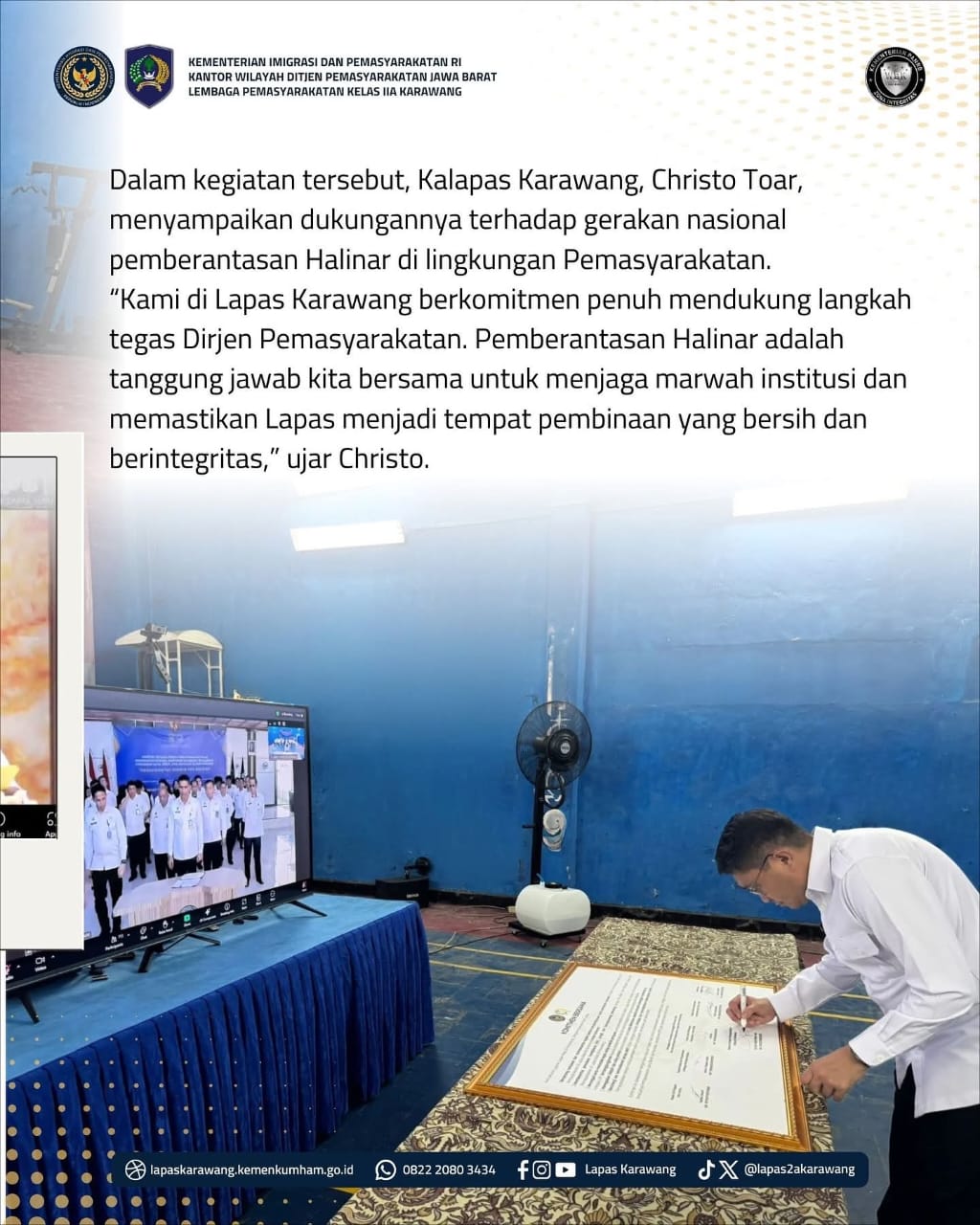 Sementara itu, Kalapas Karawang, Christo Toar, menyampaikan dukungannya terhadap gerakan nasional pemberantasan Halinar yang digagas Ditjen Pemasyarakatan.